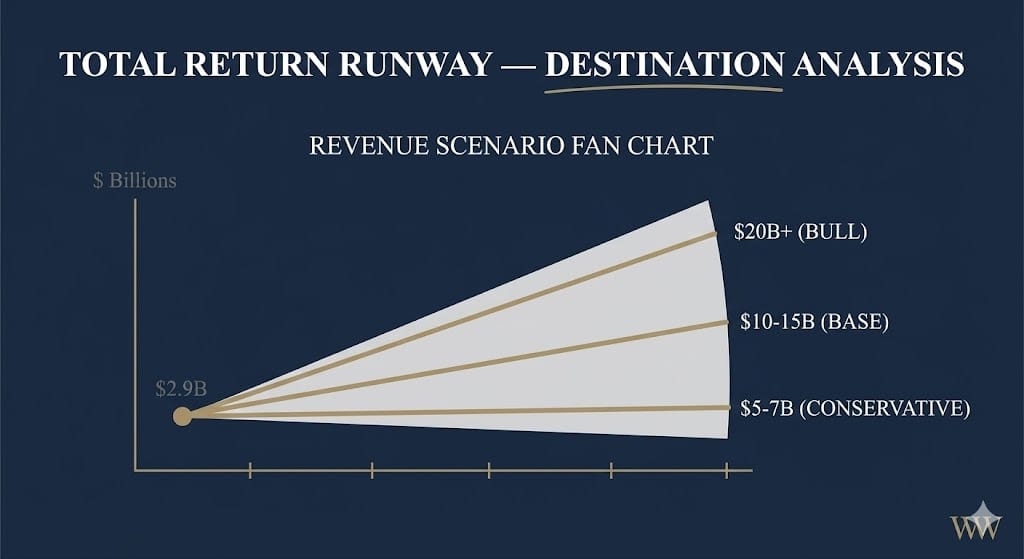 The destination analysis reinforces this: the addressable market could reach $2.75 trillion by 2030. The capital-light model converts growth into free cash flow efficiently. Plausible revenue scenarios range from $5–7 billion (conservative) to $20 billion+ (bull). Market opportunity clarity and cash flow potential both score an "A."