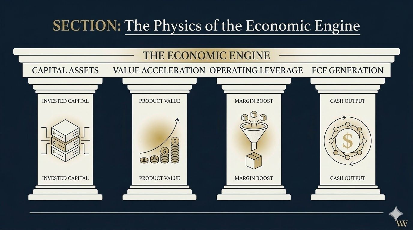 R&D, the true reinvestment vehicle, runs at roughly 18% of revenue. It's expensed rather than capitalized, which understates the engine's real return characteristics.