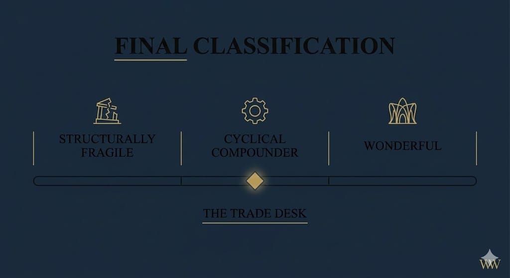 The Trade Desk is a capital-light, high-retention demand-side platform that earns a percentage of every advertising dollar it processes — a scalable toll-road model — but its long-term compounding depends on whether the open internet can maintain relevance against the data gravity of vertically integrated walled gardens.