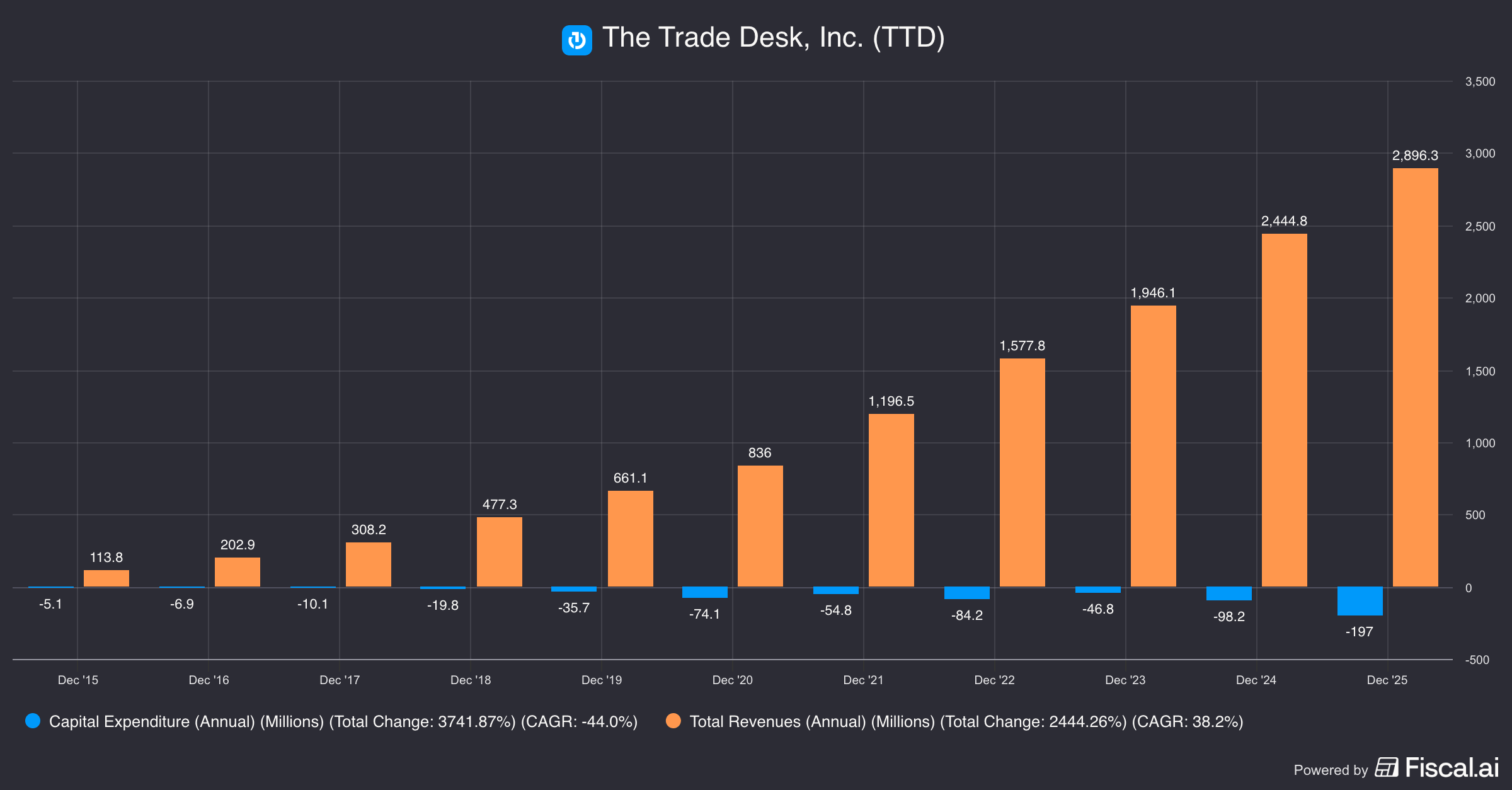 Capital intensity is minimal. The business scales without linear cost increases. Capex in 2025 was approximately $197 million on $2.9 billion of revenue — about 7% of sales.