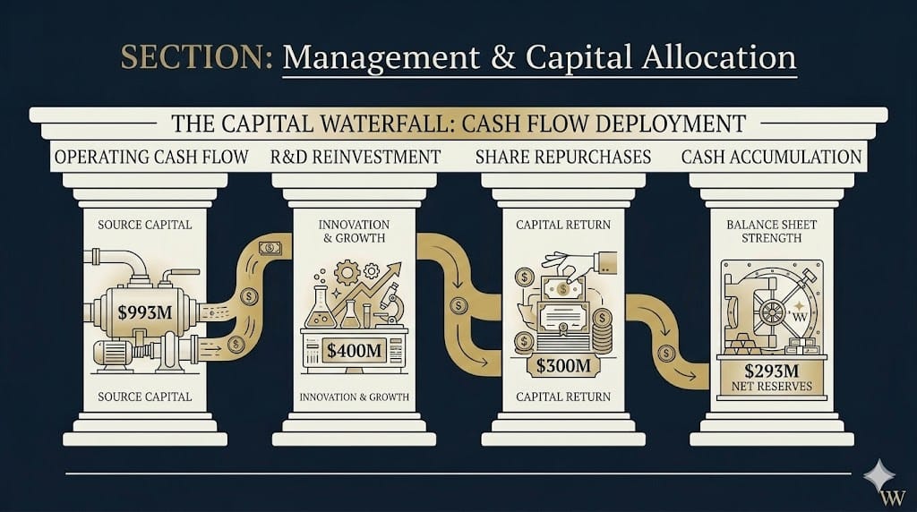 In 2025, approximately $993 million in operating cash flow. Roughly $800 million in free cash flow. FCF margin of 27–33%, depending on the period.