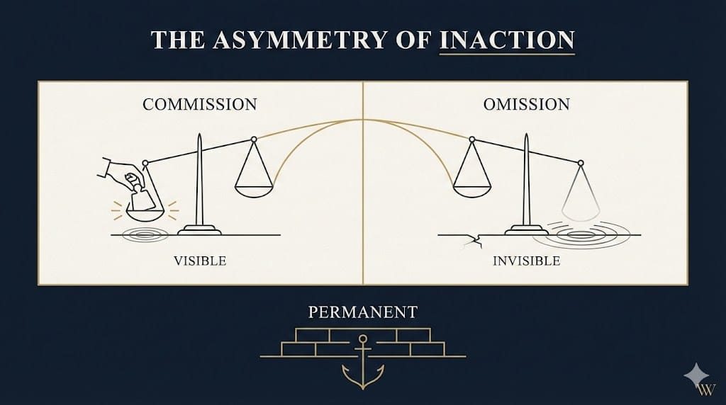 Over long horizons, the composition of an investment portfolio is shaped less by what went wrong than by what the investor declined to do when the evidence was clear. Financial statements record transactions; they do not include entries for foregone alternatives. This measurement gap, compounded by institutional incentives that penalize visible errors more than invisible ones, produces a persistent structural bias toward under-action.
