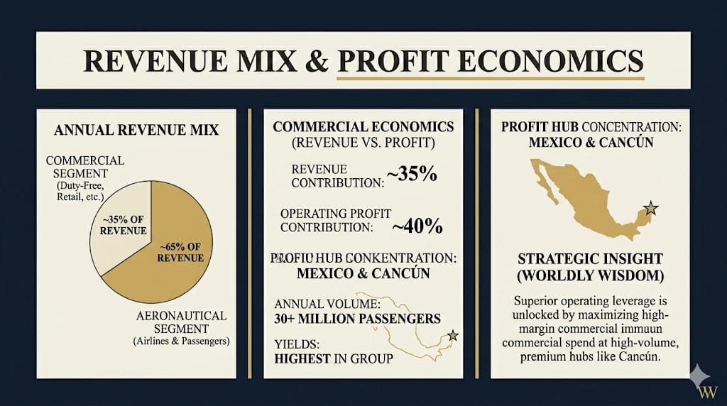 Profit is heavily concentrated in Mexico, specifically the Cancún hub, which generates the highest volume (30+ million passengers annually) and the highest yields. The commercial segment (duty-free, parking, retail) contributes ~40% of operating profit on ~35% of revenue, indicating superior unit economics and pricing power.