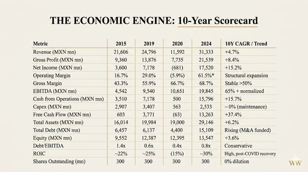 No Restatements, No Accounting Games: ASUR's financial reporting is transparent. The only material non-recurring item in the decade was a goodwill impairment on Aerostar during the 2020 COVID crisis and some restructuring charges. No creative accounting patterns detected. IFRS adjustments (FX gains/losses) are modest relative to operating cash flows.