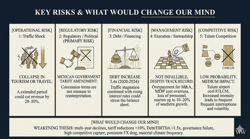 A combination of regulatory tightening (10–15% fee reduction) + traffic shock (recession driving 20–30% pax decline) + rising interest rates (doubling debt service costs) occurring simultaneously would stress the business severely. Probability of all three occurring in the next 2 years: <5%. Probability of any one occurring: 20–40%.